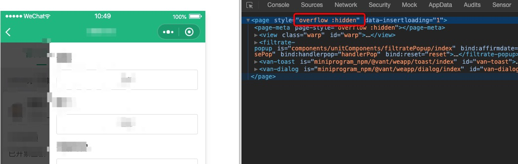 - 使用page-meta组件,通过该组件我们可以操作Page的style样式,类似于h5里body设置overflow: hidden; 控制页面不可滚动。文档地址:https://developers.weixin.qq.com/miniprogram/dev/component/page-meta.html