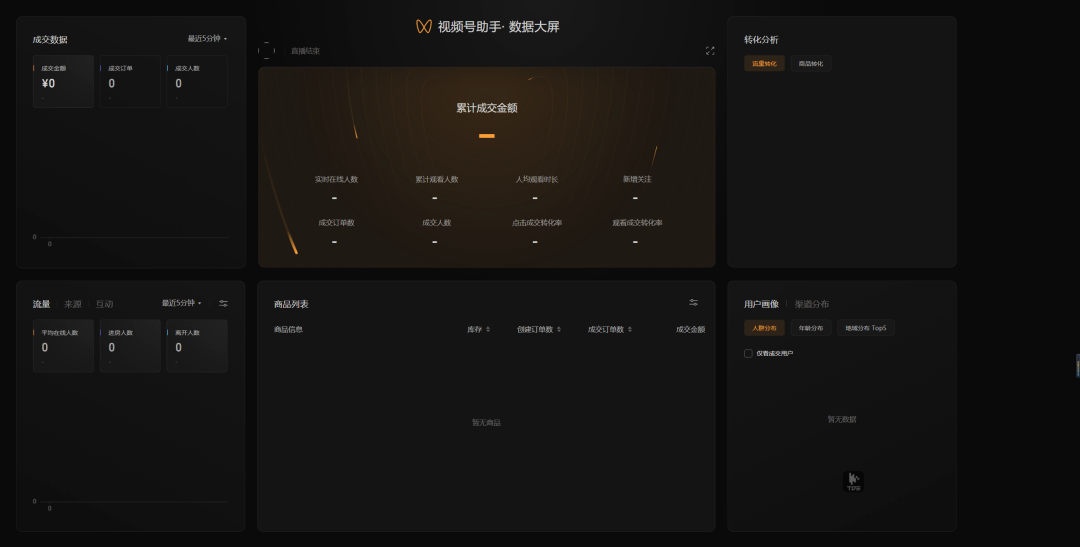 比如近期视频号助手新增直播带货大屏功能,展示累计成交金额、用户画像以及转化分析等核心数据,流量来源还包括公众号、小程序等私域。