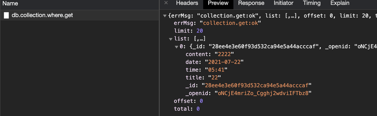 我们会发现手动新增的数据和使用云API新增的函数新增的数据不一样,这条数据多了一个“_openid”的字段。这个 _openid 是代表当前用户的唯一识别,每个用户在一个小程序中 _openid 就是代表这个用户,在不同小程序中 _openid 是不一样的。