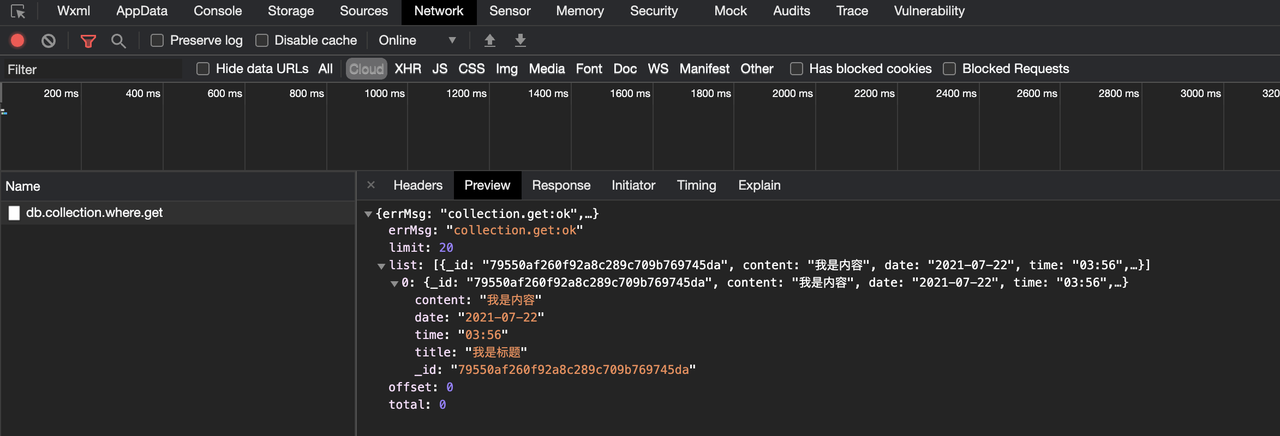 接下来在看调用看看,在这里告诉大家一个调试技巧,使用调试器中的Network面板,然后选中Cloud标签进行过滤,在这里我们就可以刚才调用API请求。