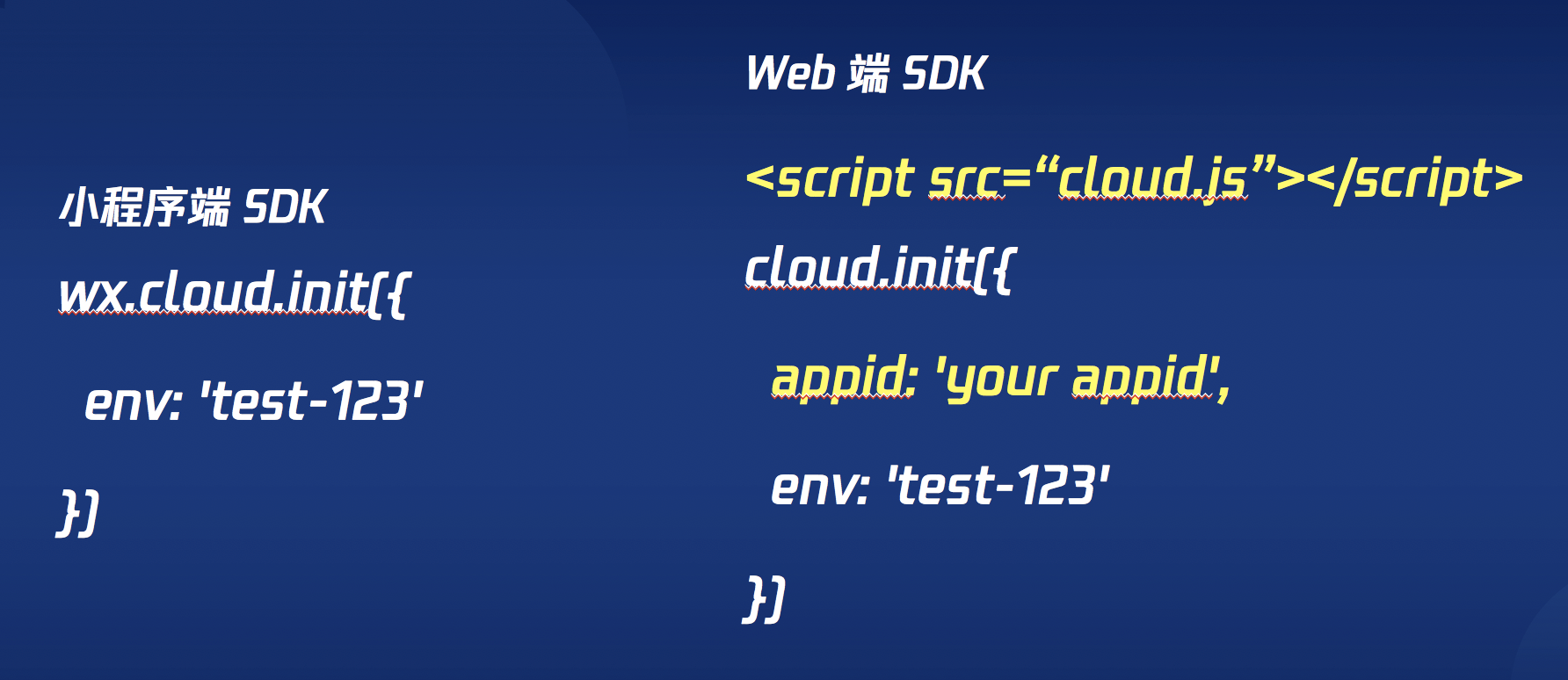 小程序端 和 Web 端都有SDK可以调用云函数,小程序直接使用 wx.cloud,云开发则需要引入 cloud.js,然后使用 cloud。