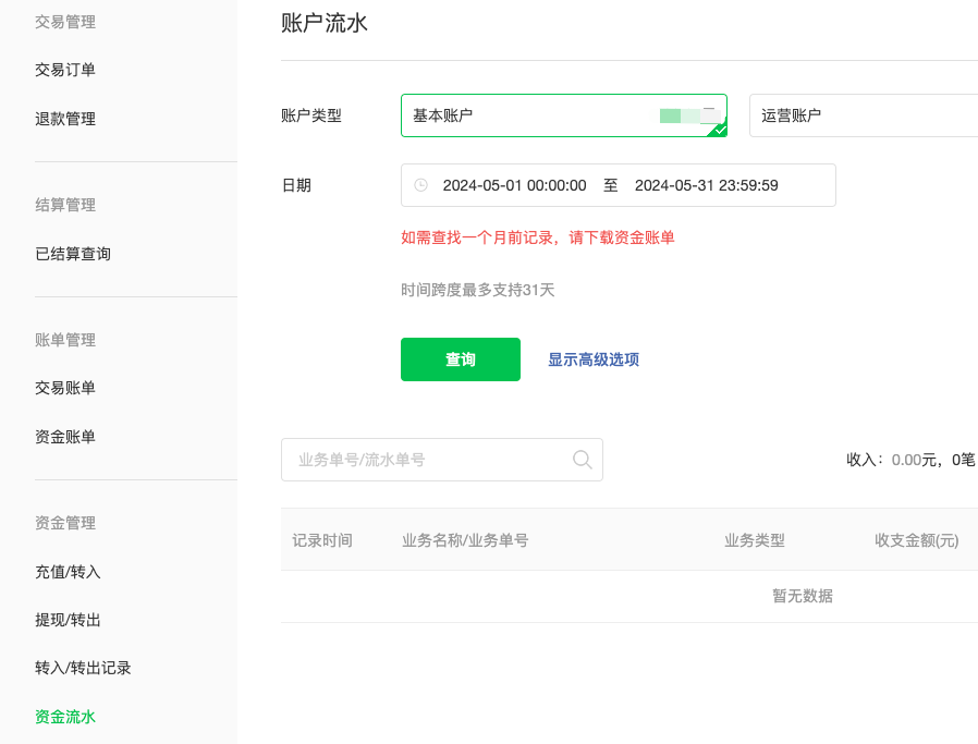 2、资金流水查询时间可以优化一下日期范围,可视化界面列表看比较直观一些。