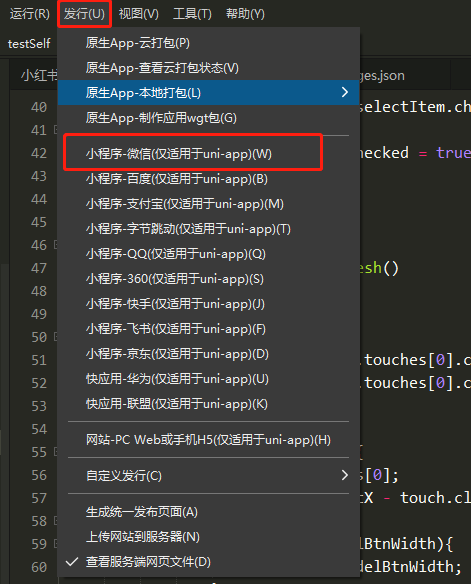 2、所以,可以选择发行>小程序-微信,注意括号的内容,只适用于uni-app