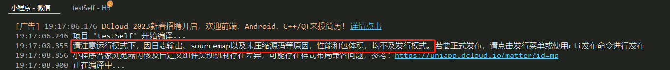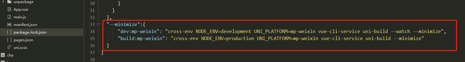 3、另外,在package.json文件里面加入 --minimize 最小压缩 "dev:mp-weixin": "cross-env NODE_ENV=development UNI_PLATFORM=mp-weixin vue-cli-service uni-build --watch --minimize","build:mp-weixin": "cross-env NODE_ENV=production UNI_PLATFORM=mp-weixin vue-cli-service uni-build --minimize"