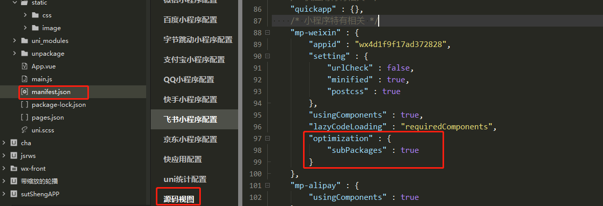 首先,点到 manifest.json 文件,点击源码视图,找到 mp-weixin 也就是微信小程序的相关设置,添加 "optimization" : {"subPackages" : true},意思是允许分包