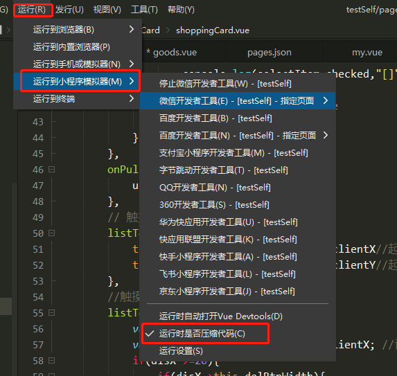 1、我的开发工具是HBuilderX,所以,在运行小程序的时候可以勾选 运行>运行到模拟器>运行时是否压缩代码,