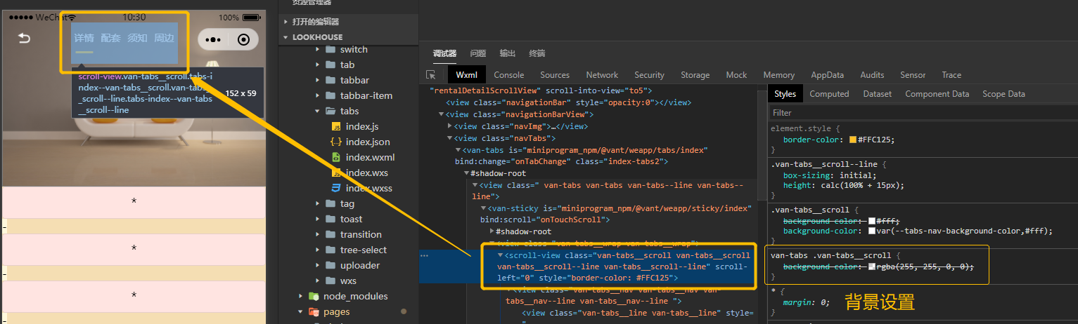 5:重点来了,tabs组件的样式如何修改?这个涉及到了第三方组件样式和外部界面隔离的问题,也就是无法直接通过指定一个class去修改样式,需要在其对应子元素节点中进行设置