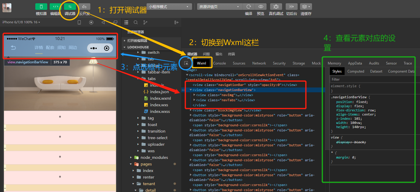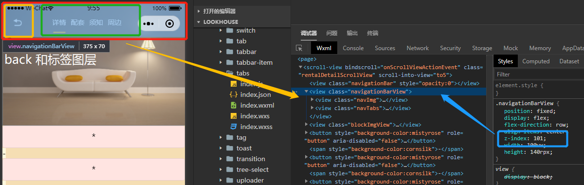 2:导航栏和标签以及back图标的布局方式,导航栏那层view应该位于标签和back下,也就是z-index要低于标签和back,同时他们的position都是固定的;