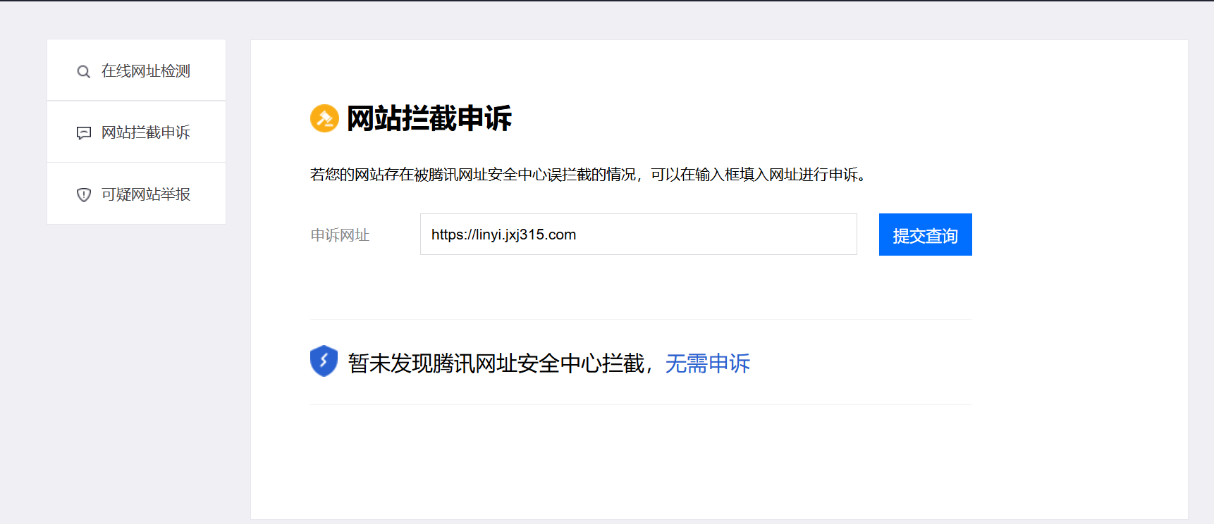 方法二:【访问腾讯安全-网址安全中心】,通过“在线安全->网站拦截申诉”功能进行申诉。