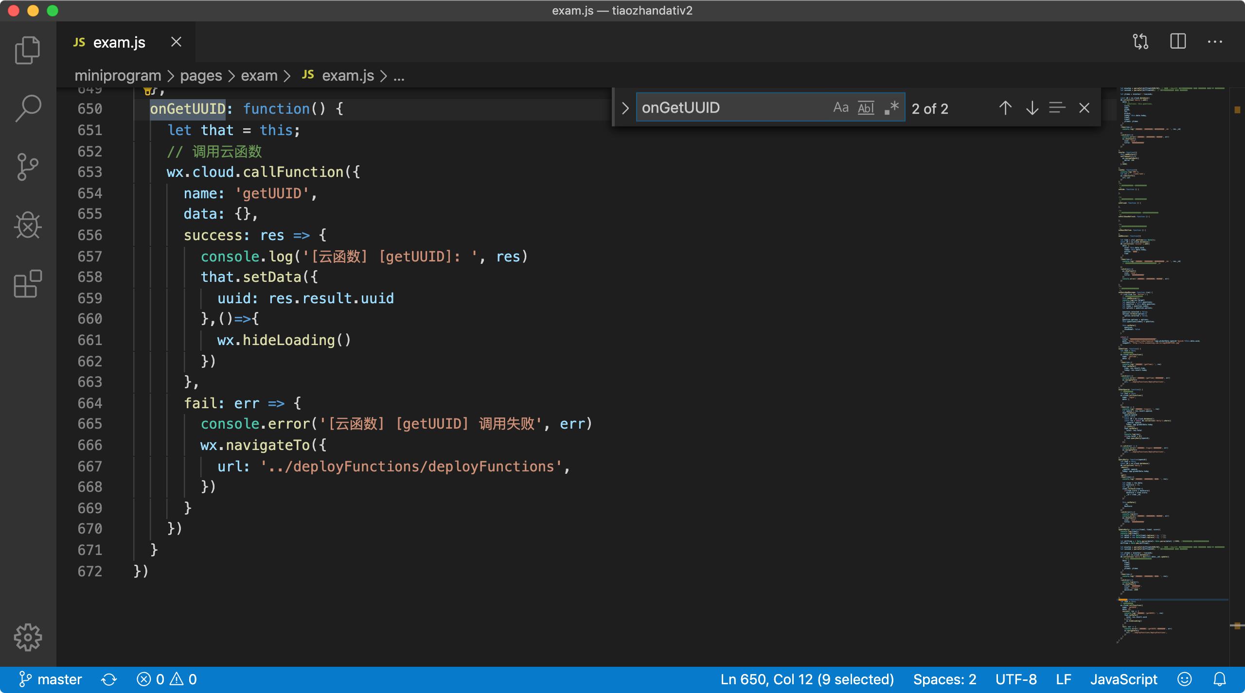 就是下面的onGetUUID,本来这个函数是在onShow里面调用,我在分享发现这个现象之后,把onGetUUID调用挪到onLoad里面了,因为我必须保证一次答题这个UUID是不变的,用来控制每次答题只有一次复活机会
