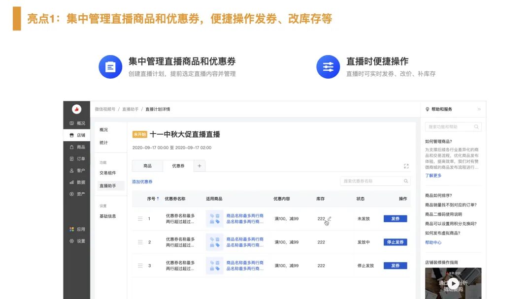 针对上面这些问题,我们特意上线了「直播助手」和「直播优惠券」这两大功能,帮助大家更好地管理直播活动、便捷查看直播效果、通过发放直播专属优惠券刺激用户快速下单。