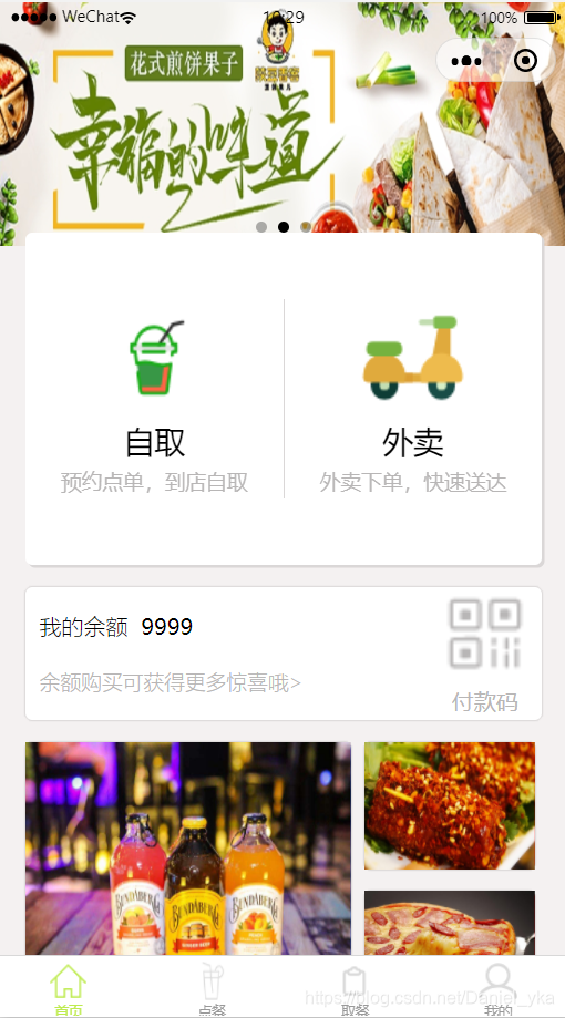 主页面顶部一个轮播图,包括手机的通知栏,显示的更加的beautiful!中间自取和外卖view是通过绝对定位钉顶上去的,另外有轻微的阴影,这样看起来有层次感,让人一看上去就有种想点单的感觉