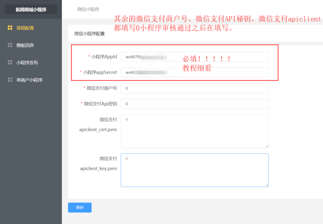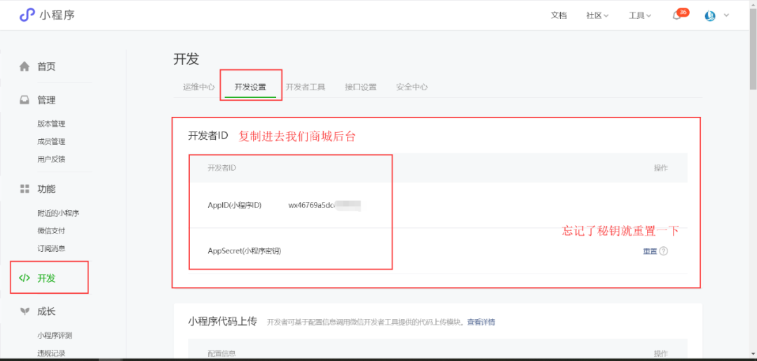 6.在基础配置中 配置小程序id 跟小程序密钥,从微信小程序公众平台里获取。开发-->开发设置-->AppID/AppSecret