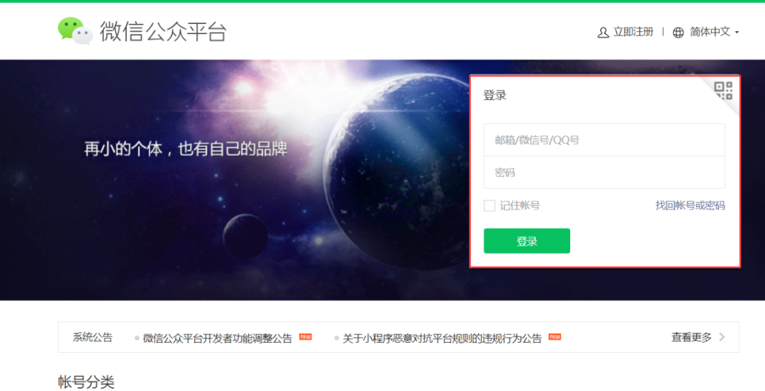 5.登录微信公众号平台小程序账号;(登陆的是公众号的“小程序账号”登陆进去右上角显示“小程序”就登陆成功)快捷登录入口:https://mp.weixin.qq.com/