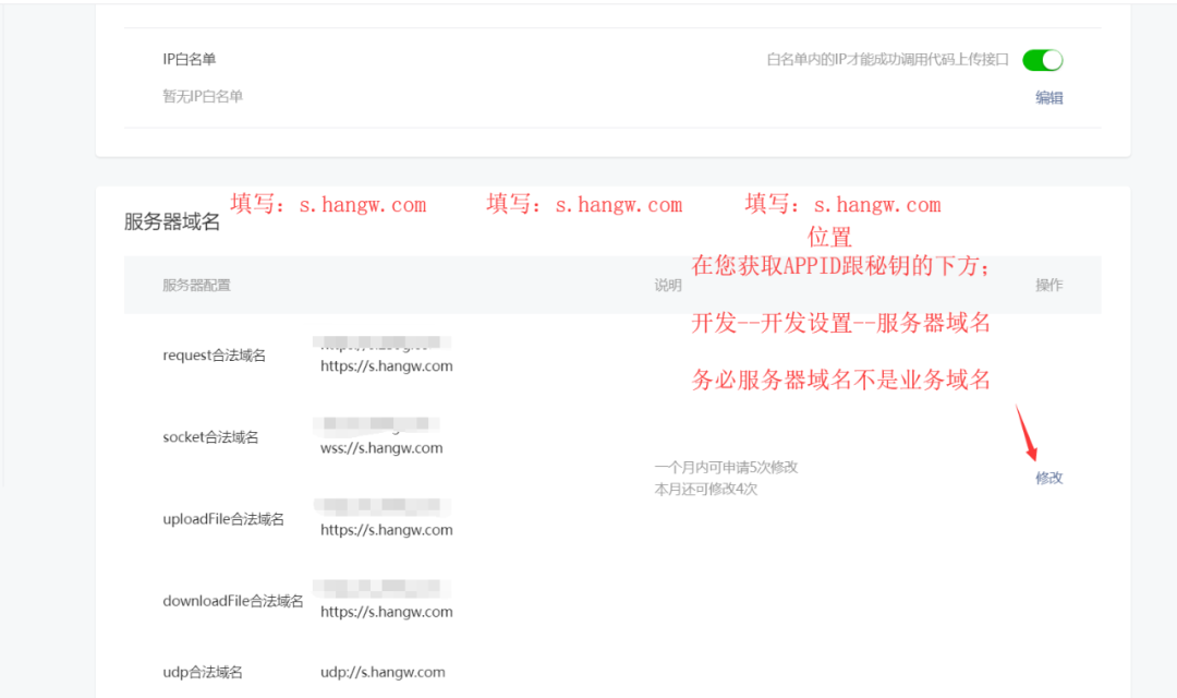 7.将商城访问网址域名填写到小程序后台(mp.weixin.qq.com)设置—开发设置—服务器域名