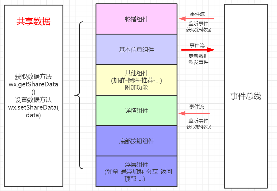 原理:应用事件总线进行事件传递,并将数据挂载到wx上用于各个组件模块共享