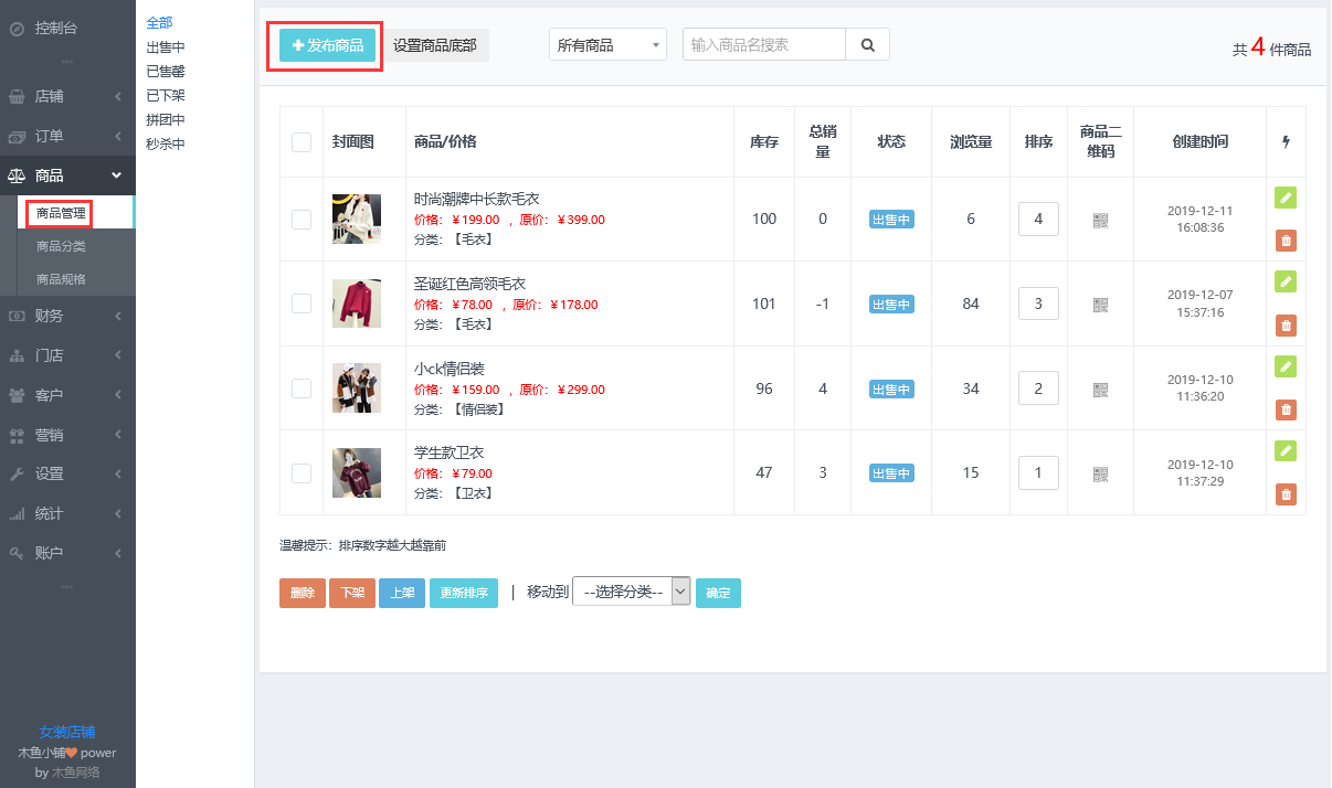 进入管理后台之后,首先我们需要上架商品,在上架商品之前,首先需要我们进行商品分类。先创建商品分类,创建完成之后,开始上架商品。点击“发布商品”按钮,按照提示去填写相关内容。