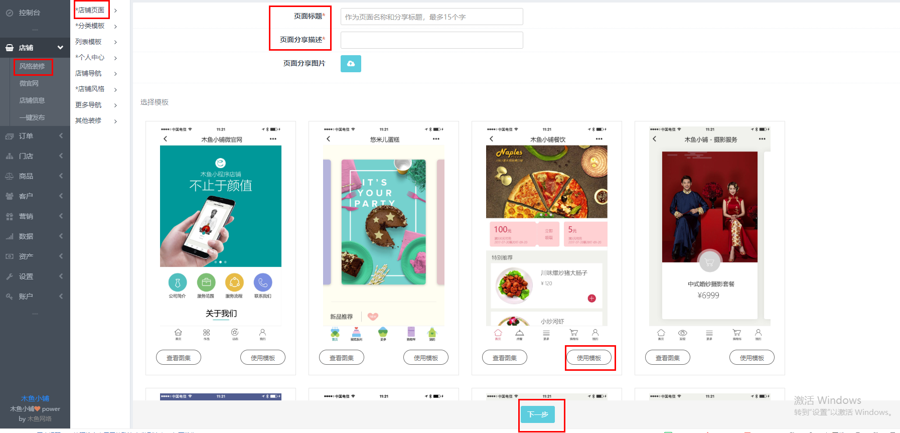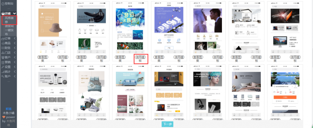 商品上架完成之后,我们开始装修店铺,在“风格装修”页面中,点击“新建页面”,在各行各业中,选用合适的模板,点击“使用模板”,点击“下一步。”