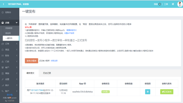 在上架完成之后,点击“一键发布”,先配置好微信支付和APP秘钥,设置完成之后,点击“立即授权”,等到木鱼小铺(https://www.muyu007.cn/)官方审核通过之后,会出现一个发布小程序,点击“发布小程序”,需要注册小程序管理员微信扫码,点击“体验码”,扫码之后,可以在手机端看到体验版,体验版测试完成之后,点击“提交审核”,等待微信官方审核通过,就可以通过微信搜索到小程序名称就能看到您的微信小程序了。