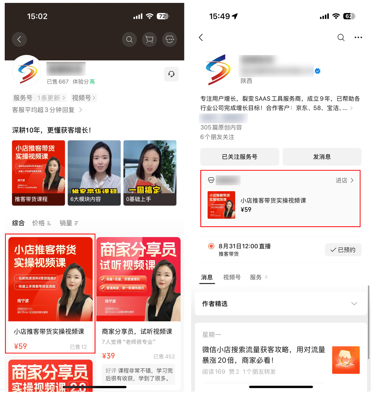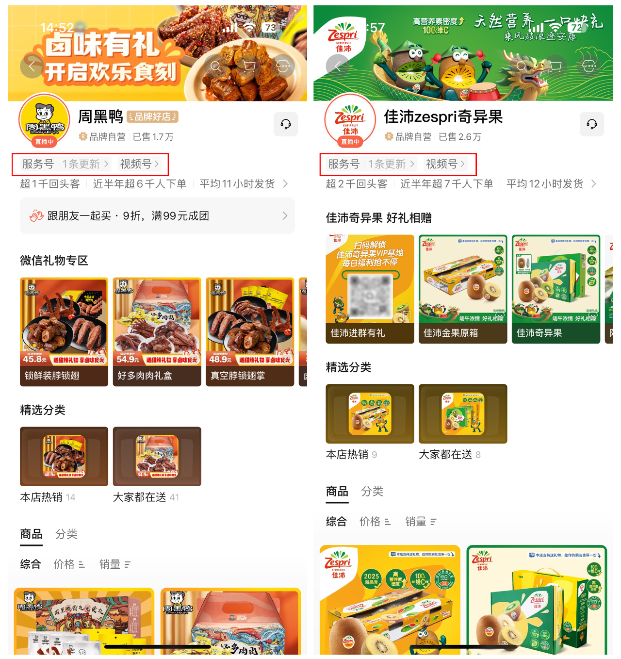 如果商家设置了对外展示账号,在小店主页可查看关联的视频号、公众号或服务号,用户点击即可跳转到对应的账号,实现流量互通。