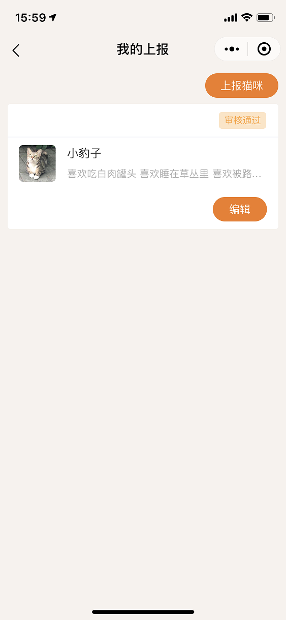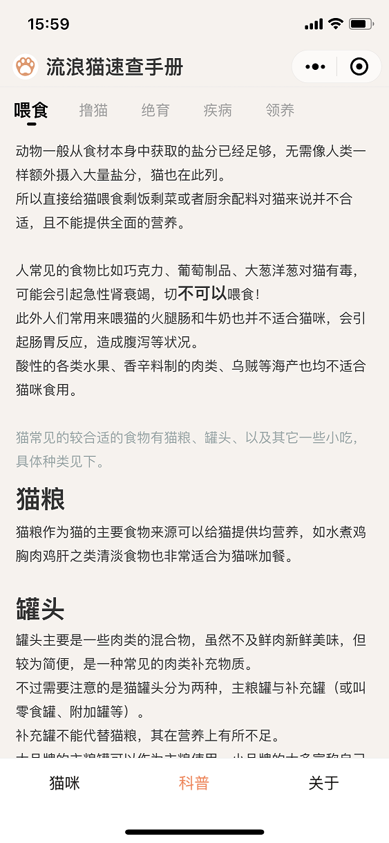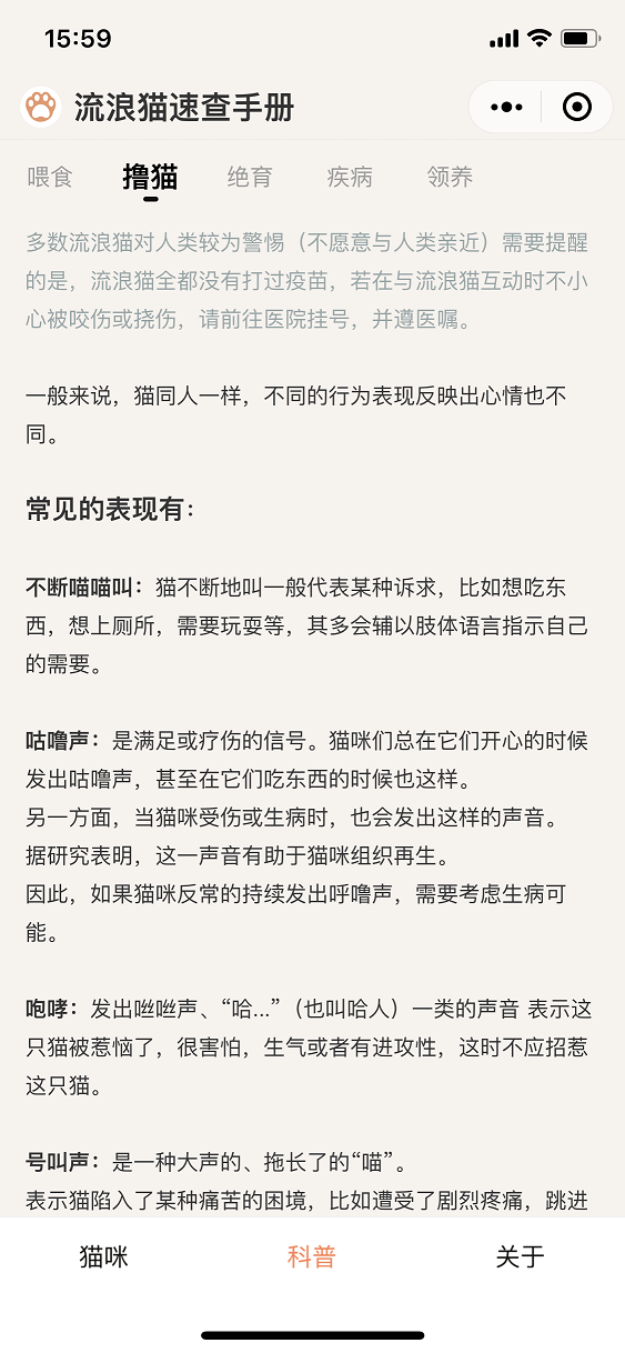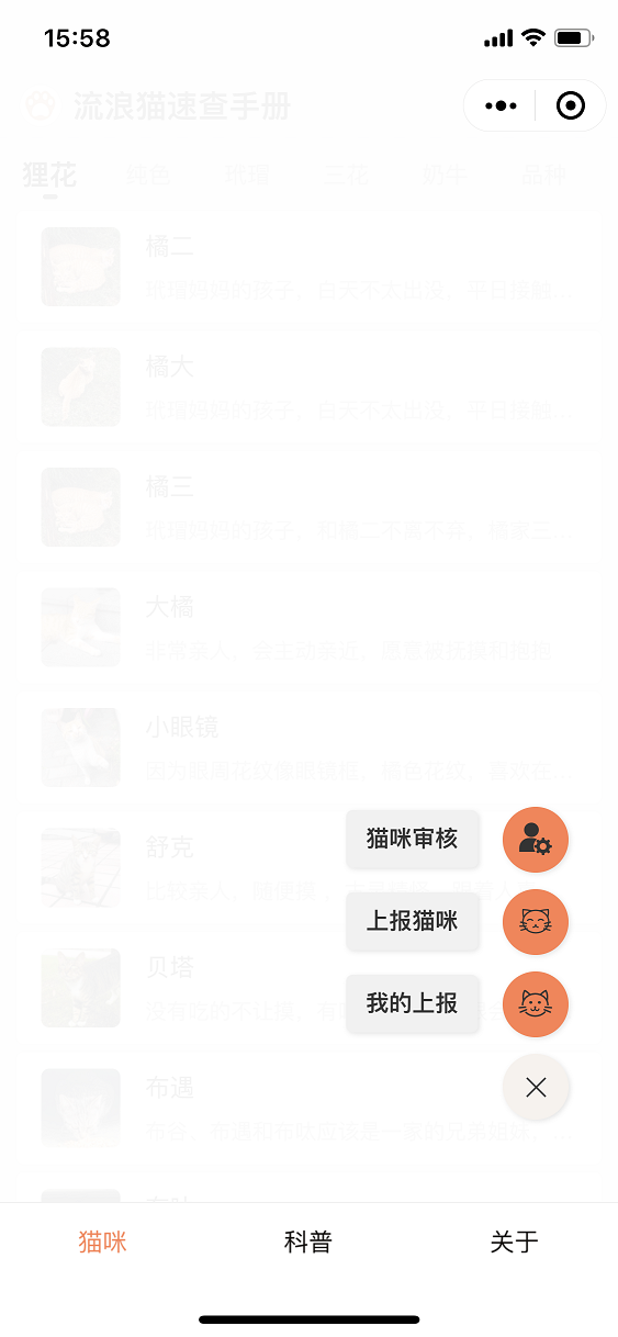 今年5月中下旬,作者在网上发现了一款非常有爱的小程序,叫做《燕园猫速查手册》,因为作者本身也参与流浪猫的救助工作,流浪猫的管理主要是靠记忆,非常不方便管理,于是用业余时间参考《燕园猫速查手册》开发了《流浪猫速查手册》小程序,主要针对的是社会上的流浪猫信息的管理。后续也会开放 领养 等模块,致力于倡导大家关爱流浪猫,领养代替购买。