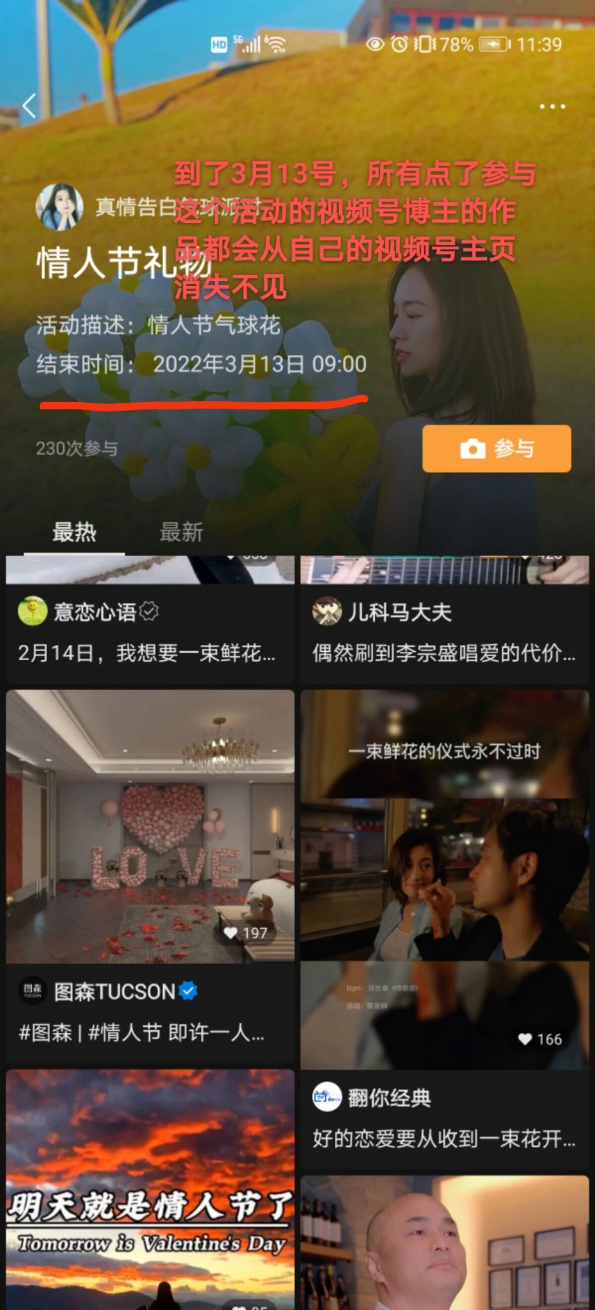 以下截图:第一张是我当时发作品点了参与活动的标题(目前搜不到这个活动标题,因为已经过期,同时我作品也消失了在我的视频号主页了,只能到点赞历史找到);图二是我搜了一下当时参与活动关键字,确实搜不到之前那个活动,只能搜到日期是2月14号往后的活动;图三是我今天发视频参与的活动标题,有活动截止时间,到了截止时间所有发作品点了这个活动的视频都会全部消失。如果是bug请求尽快恢复,把我之前发布的作品恢复到主页展示,我的理解是活动结束,作品不应该消失,希望是bug,而不是产品本意就是这么反创作者和反视频号平台,真的很伤平台和用户,损伤太大了,可以说是致命的伤害,盼排查回复--一个希望微信视频号能做起来的创作者(目前看很失败)