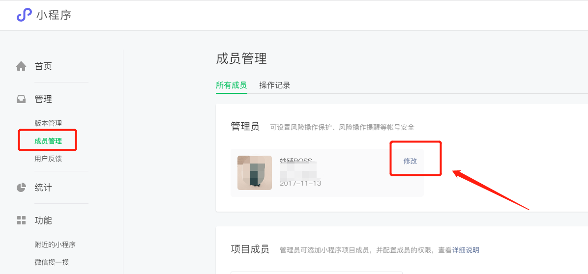 2、将现有的小程序或者公众号管理员,修改改成其他人的,例如亲戚姐妹等... 此操作也需要登录微信公众平台(修改之后不会马上释放管理员,一般有一两天的延迟)。如下图所示: