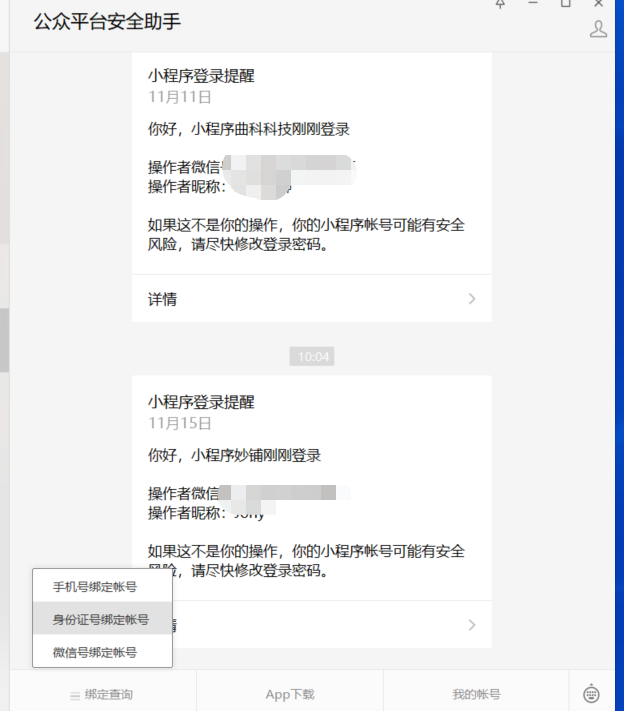 有的小伙伴又要问了:我不知道我的身份证绑定了哪些小程序和公众号怎么办?你只需要搜索微信公众号:公众平台安全助手,关注公众号,点击底部导航菜单“绑定查询”,选择“身份证号绑定账号”,就可以快速查询到你当前身份证绑定了哪些小程序和公众号了。如下图所示: