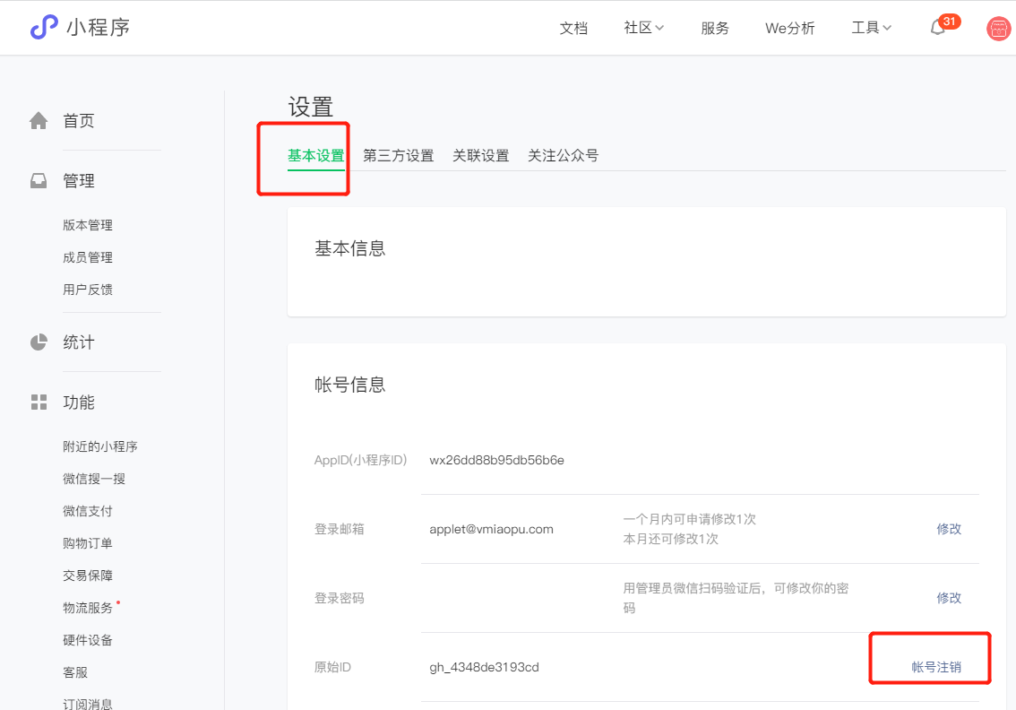1、找到不需要的小程序或者公众号,登录微信公众平台,将其注销掉,就会释放管理员身份证数量。如下图所示: