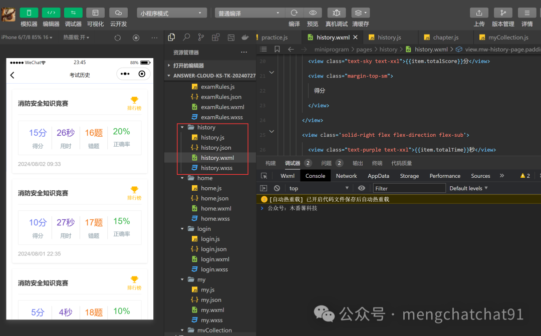 (1)WXML:构建答题历史列表,展示用户的答题记录。