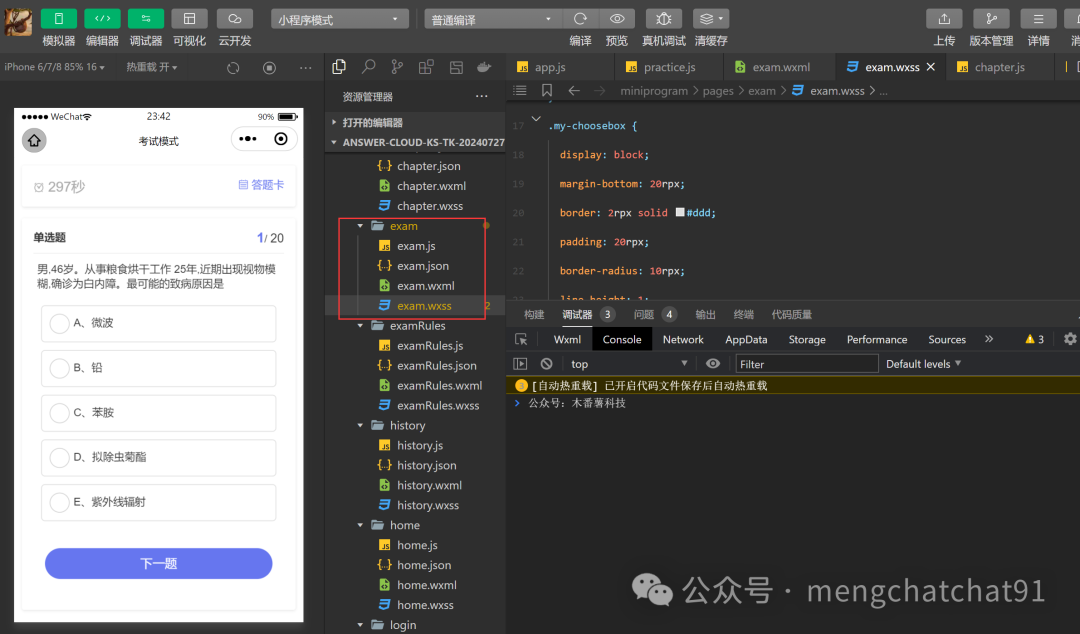 (1)WXML:构建答题考试界面,包括题目、选项按钮等。