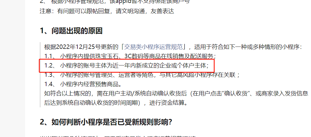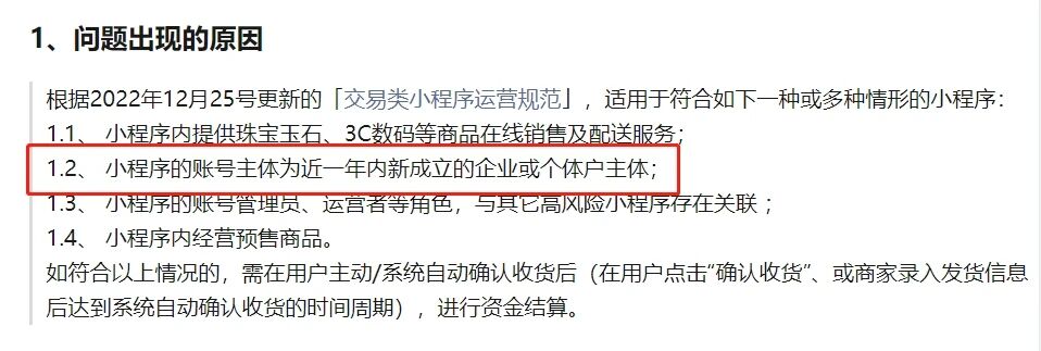 1.2、 小程序的账号主体为近一年内新成立的企业或个体户主体;