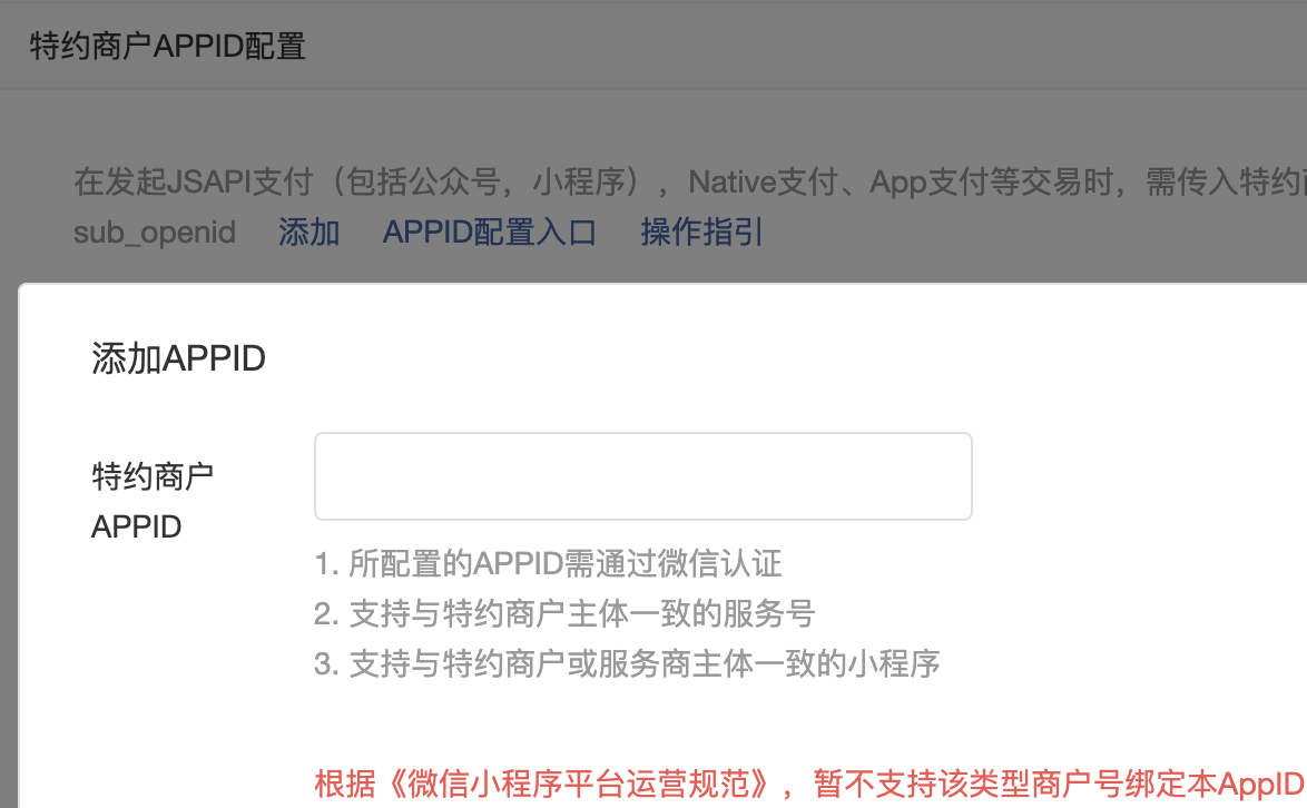 2.2 在微信支付服务商后台为子商户绑定APPID时,提示“根据小程序管理规范,该appid暂不支持绑定该商户号”或“根据《微信小程序平台运营规范》,暂不支持该类型商户号绑定本APPID”
