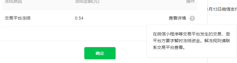 2.3 在微信支付商家后台出现不可用余额,点击显示“交易平台冻结”,查看详情为“在微信小程序等交易平台发生的交易,受平台方要求雪时冻结资金。解冻规则请联系交易平台查看。”