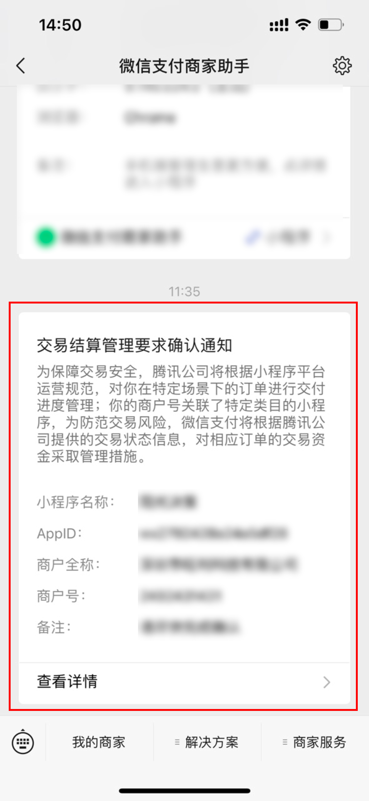 3)使用对应授权商户号的超级管理员微信前往"微信支付商家助手"公众号查看通知并确认