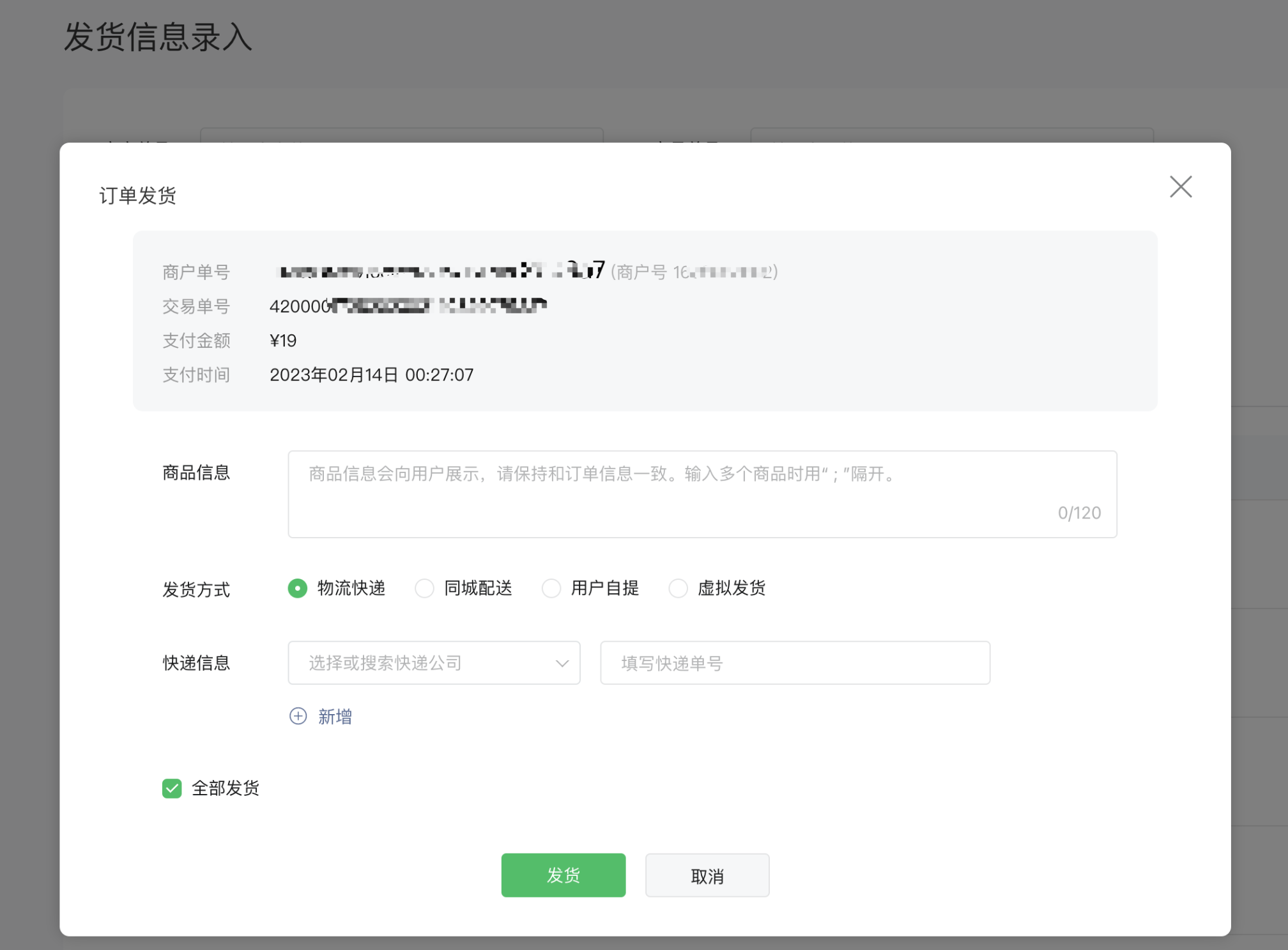 - 注意: 如发货信息录入错误,可点击订单右侧的「重新发货」按钮,修改发货信息,每个订单只允许修改一次发货信息,自动确认收货时间会根据发货修改的时间重新计算。