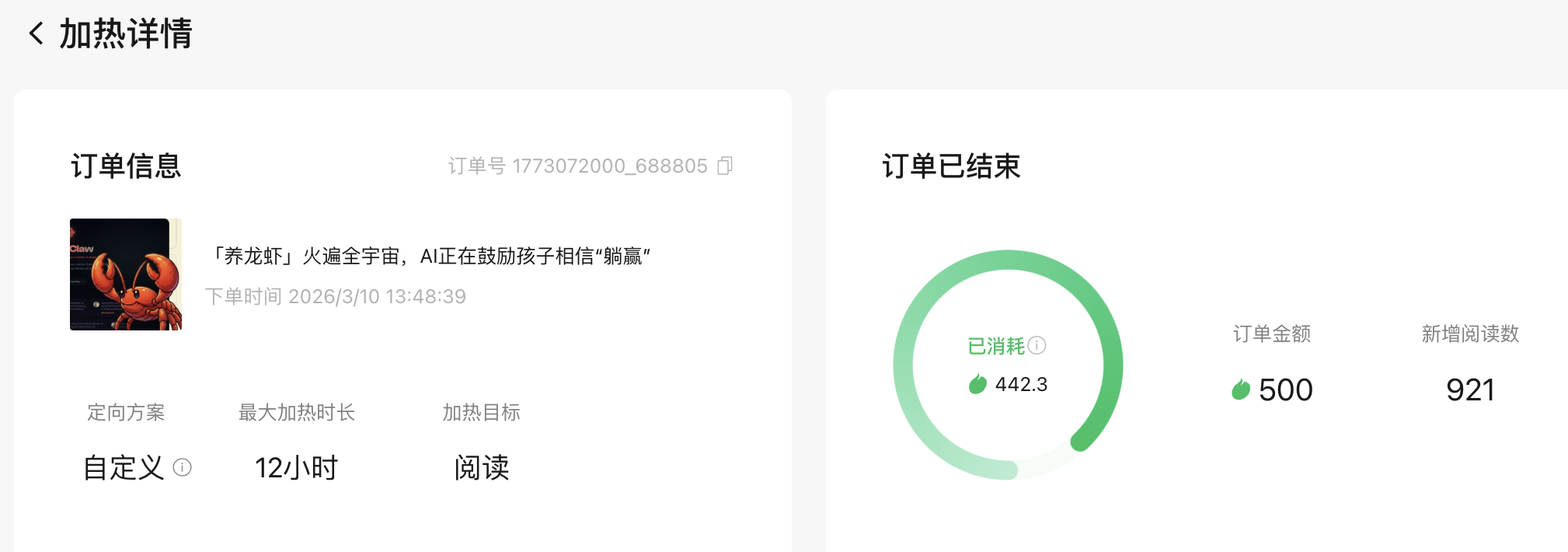 但更诡异的事情发生在后面,之后,我写了openclaw的出现对孩子的影响,文章发送后,推荐几乎为0 ,四五个小时后,阅读量还只是停留在100多,我感觉事情很诡异,于是,想第二次使用付费加热来看一下选题。这次,付费加热的整个过程非常缓慢,而且微信豆的消耗,是以0.1个为单位消耗的,导致加热时长被拖到规定时长内最慢的速度,我的理解是,官方不希望我获得短时期内的强曝光,导致阅读量猛增。但尽管如此,付费加热依然给这篇文章带来了900多个阅读,差不多是500个阅读的一倍,