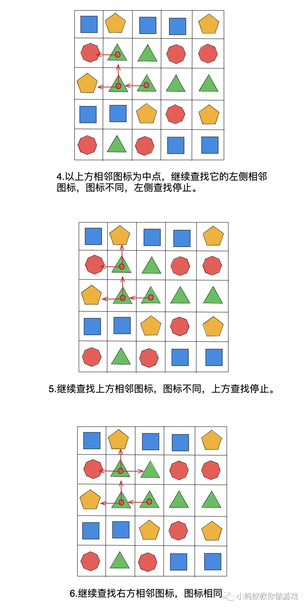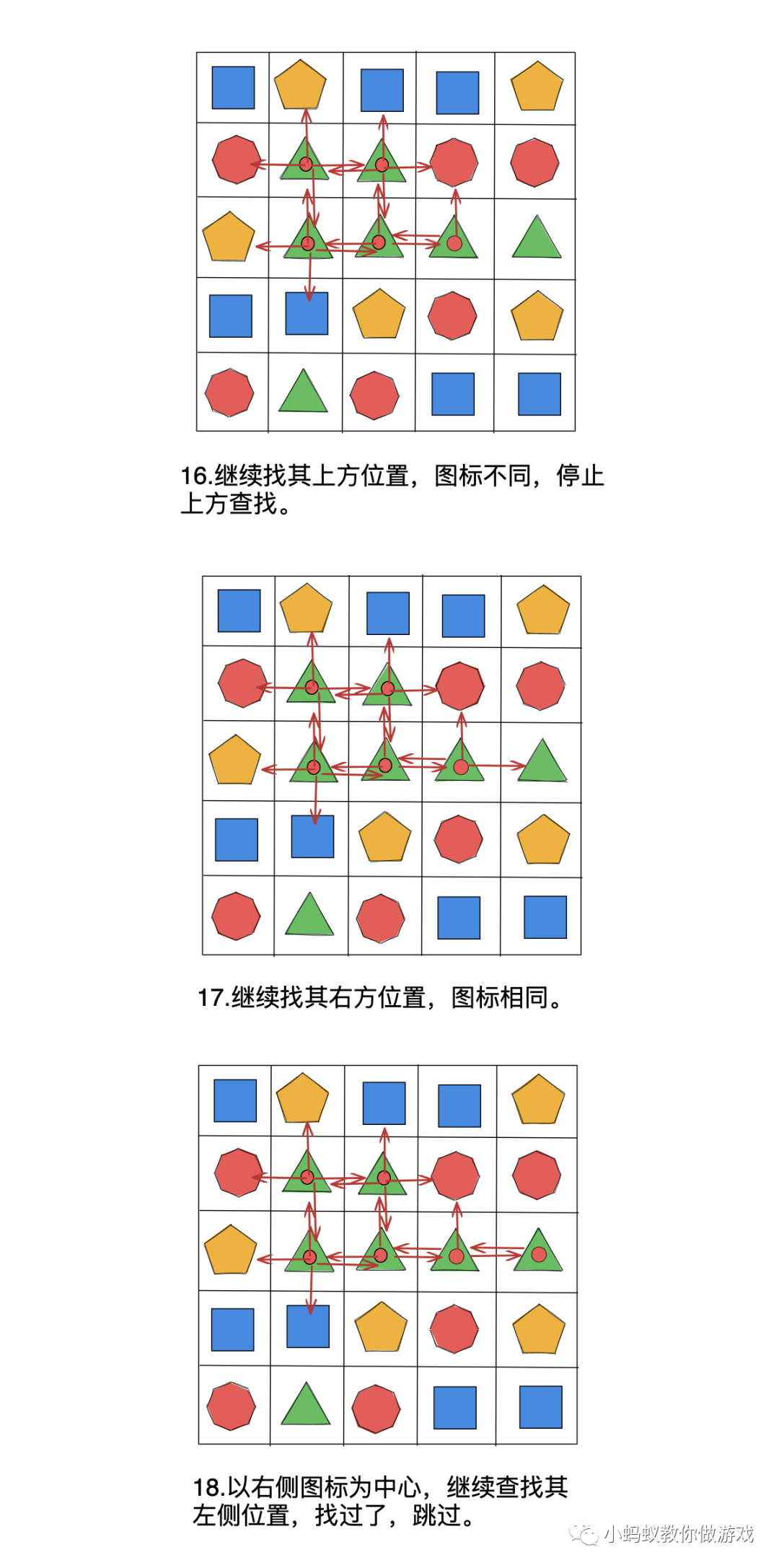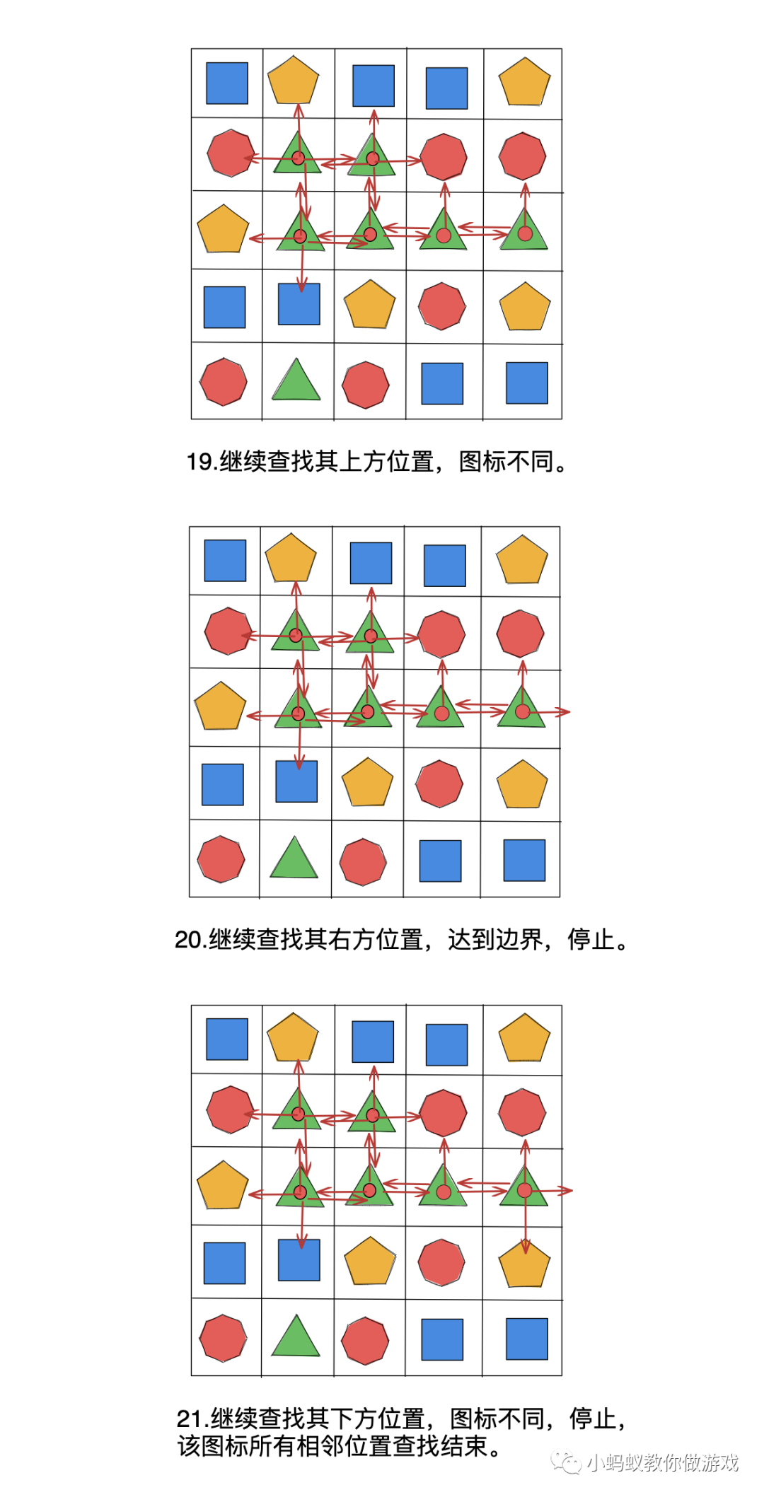 在上方的示例中,玩家点击一个图标后,一共是需要进行 23 步查找操作,才能够把所有满足条件的图标都找出来。其中比较难以理解的地方就是递归查找,找到一个相同的图标,就要以这个图标为中心继续查找。你可以把整个查找过程想象成找一个树的每一个分支,从树的主干开始找,每当遇到一个树叉的时候,都会沿着这个树杈继续向前找,只要按照这种方式找下去,那么最终回到主干的时候,就能够将整棵树的每一个分叉都找遍。