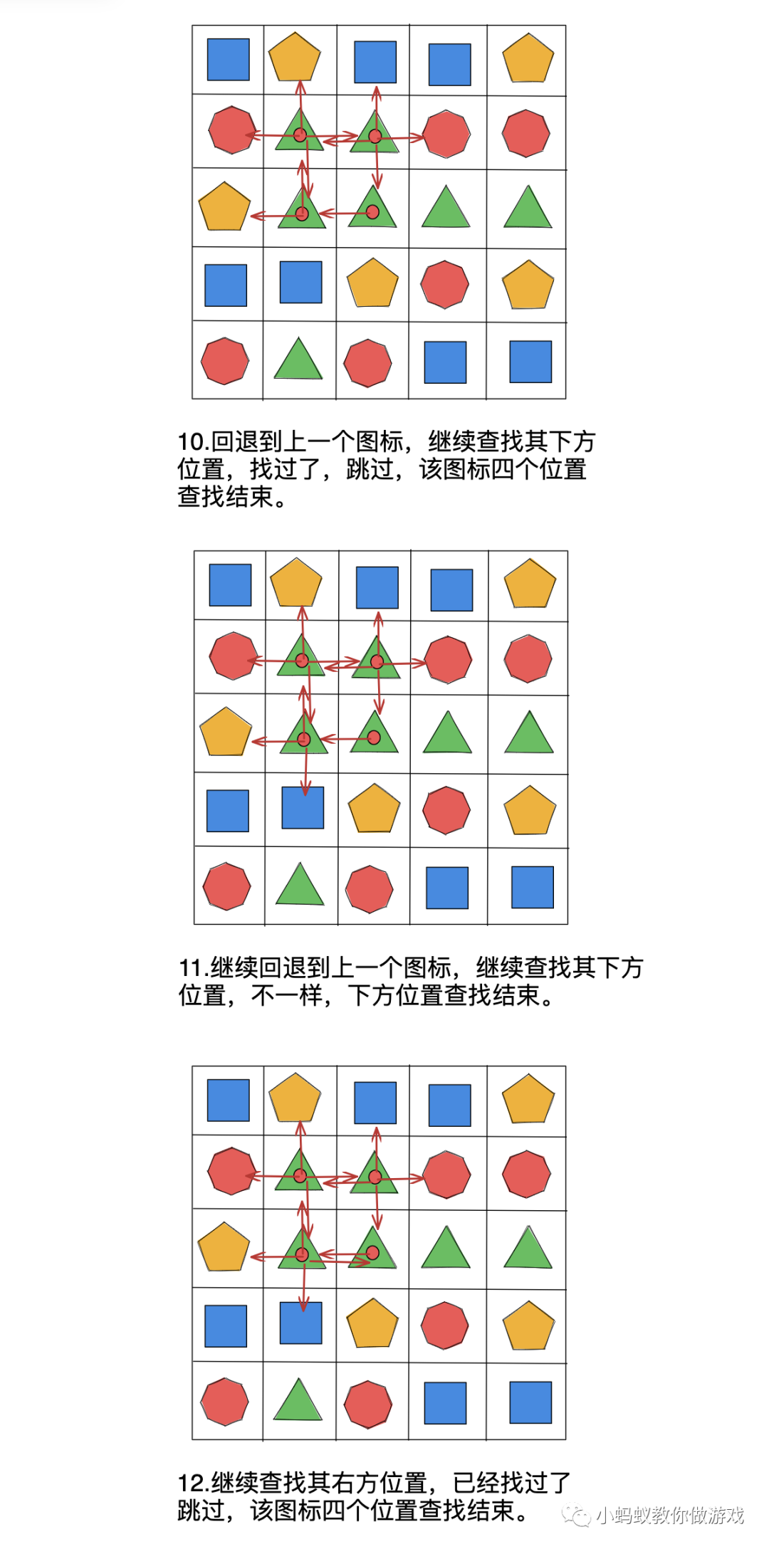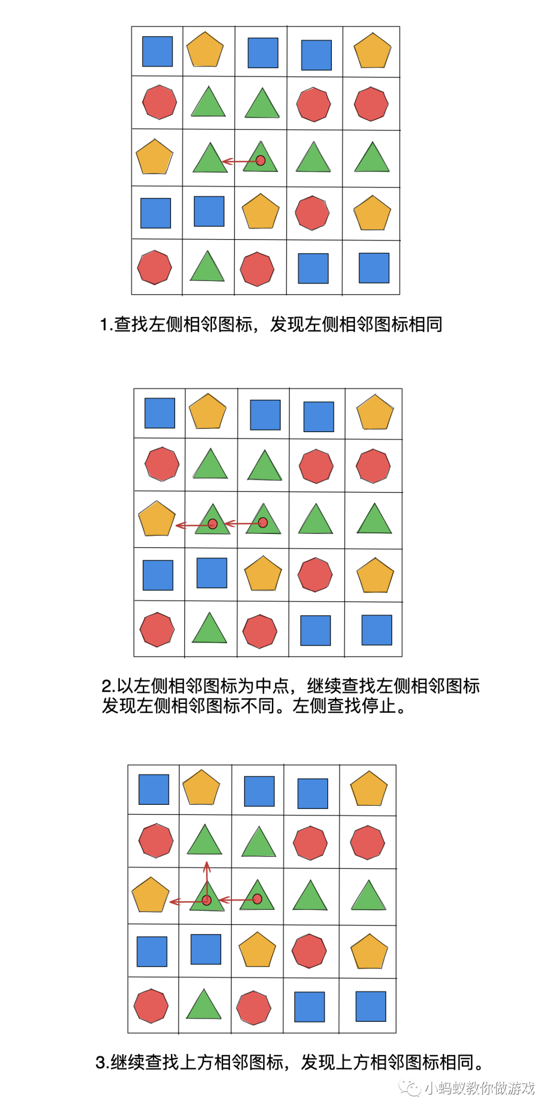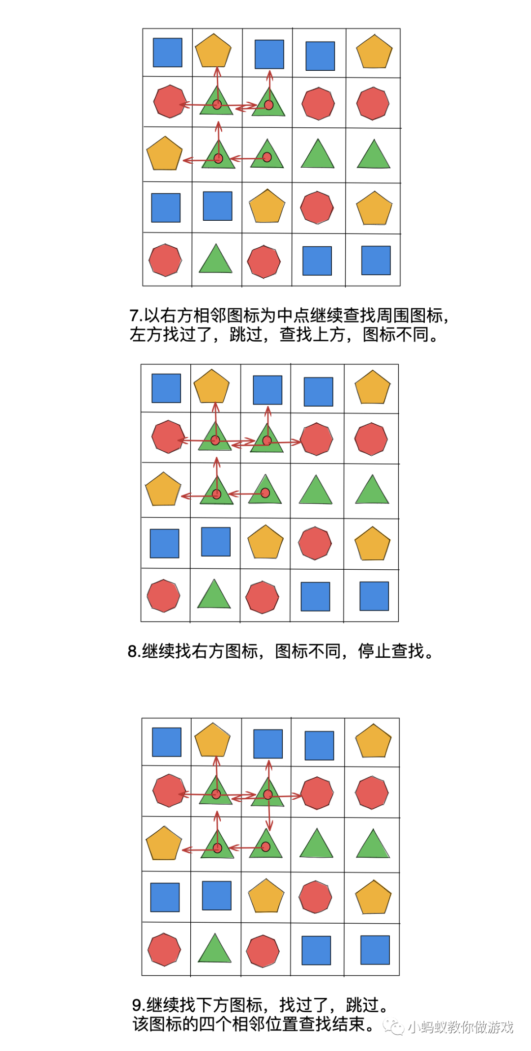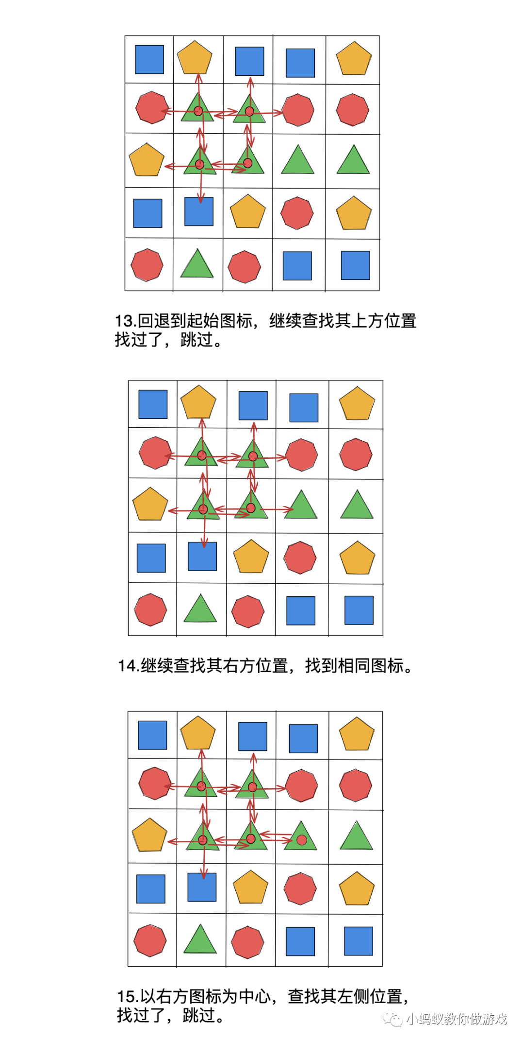 在上方的示例中,玩家点击一个图标后,一共是需要进行 23 步查找操作,才能够把所有满足条件的图标都找出来。其中比较难以理解的地方就是递归查找,找到一个相同的图标,就要以这个图标为中心继续查找。你可以把整个查找过程想象成找一个树的每一个分支,从树的主干开始找,每当遇到一个树叉的时候,都会沿着这个树杈继续向前找,只要按照这种方式找下去,那么最终回到主干的时候,就能够将整棵树的每一个分叉都找遍。