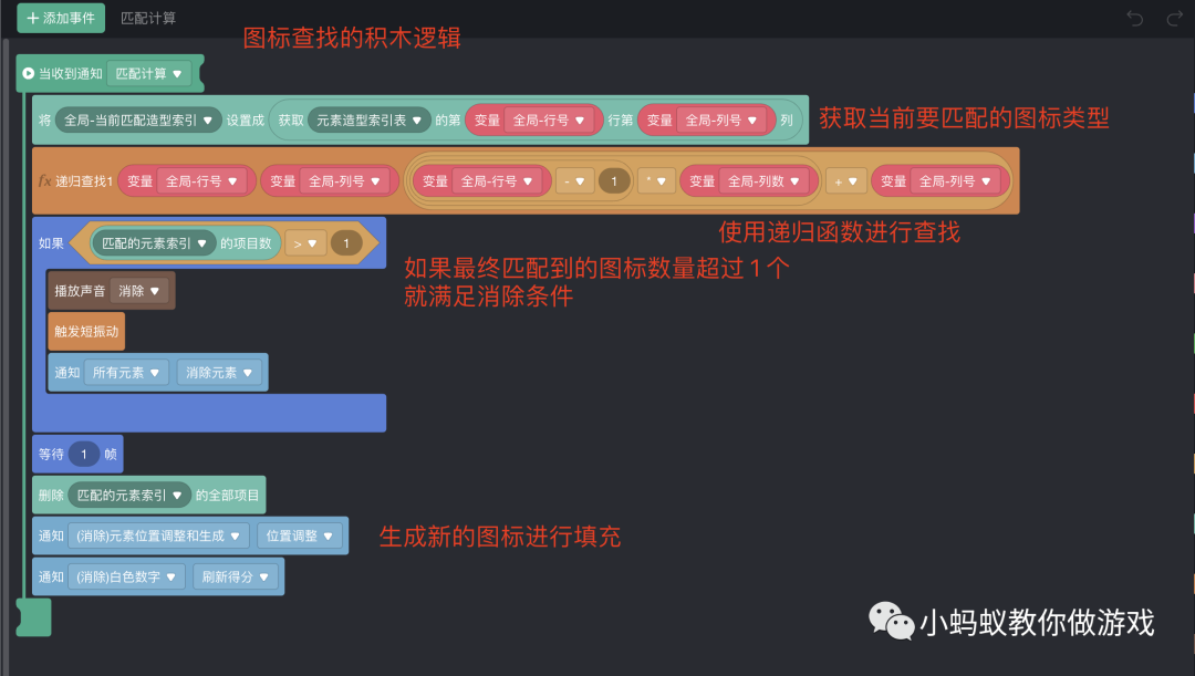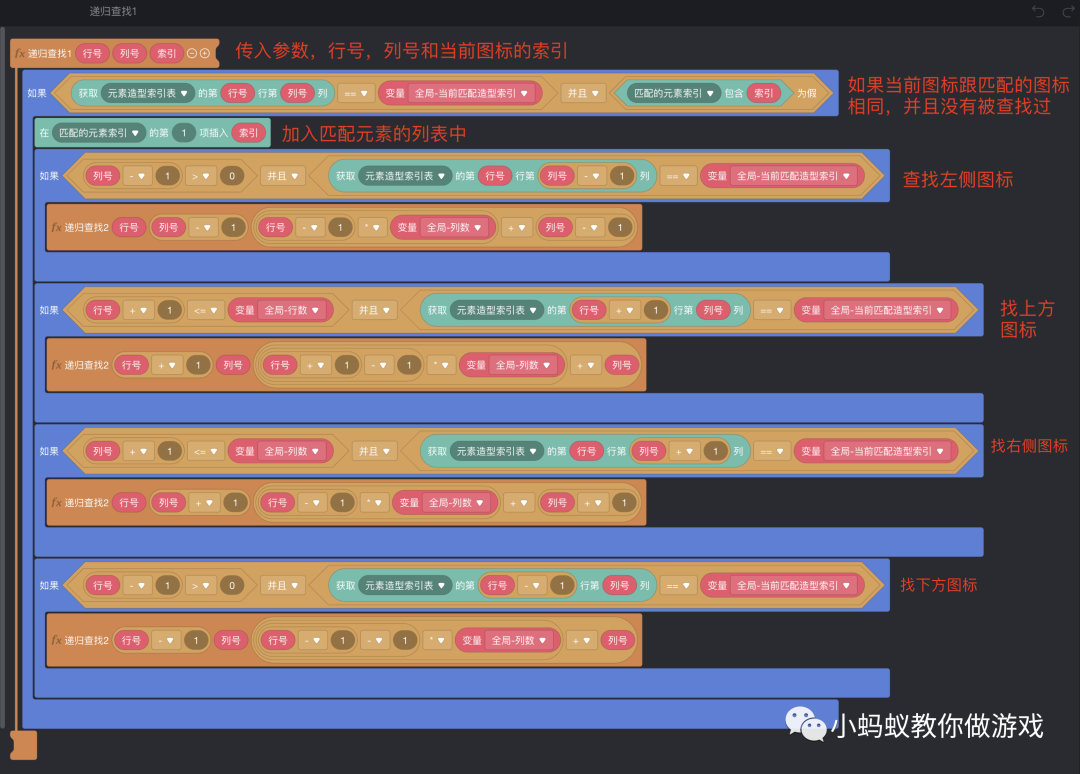 如图,要比三消的查找算法简单很多,其实最主要的就是一个递归查找函数。我们来看一下这个递归查找函数中的积木逻辑。