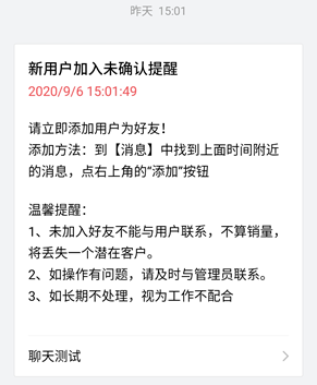 企业微信原生功能对出现单向客户关系时没有任何提醒,但我们可以借助企业微信提供的强大API接口,实现出现单向客户关系时的实时提醒,如下图所示(在企业微信自建应用中的消息):