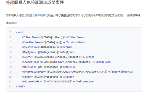 1、处理外部联系人免验证添加成员事件add_half_external_contact,获取EXternalUserID(openid)及UserID;