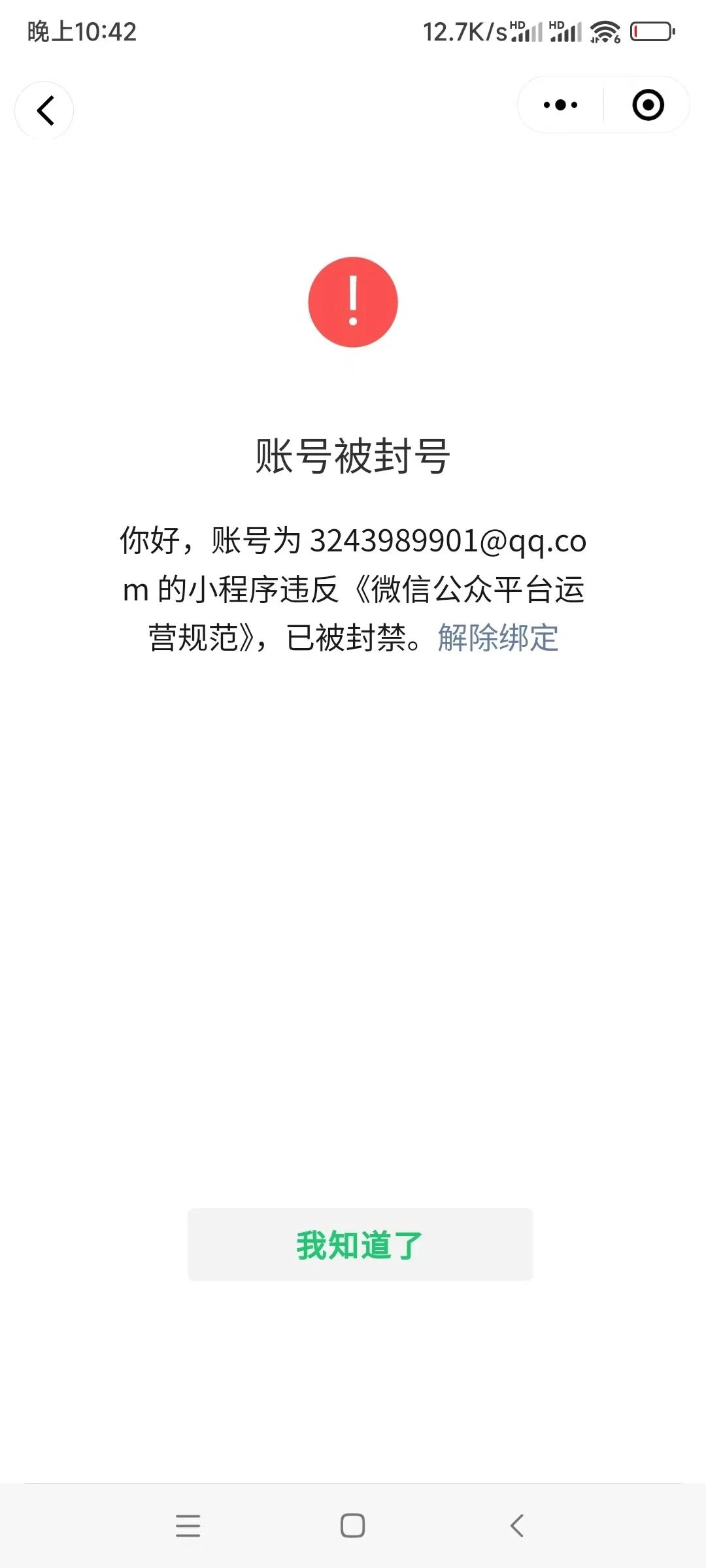 原先公司的小程序,公司用个体户注册的,每个人都绑定微信了。现在已经两年了,解绑不了,一直在微信上挂着。解绑提示200003,这也太不合理了。本什么不知道什么原因就封了,离职很久了,还是没有办法解绑。解绑也没有申诉通道。请求官方给个方法解绑。