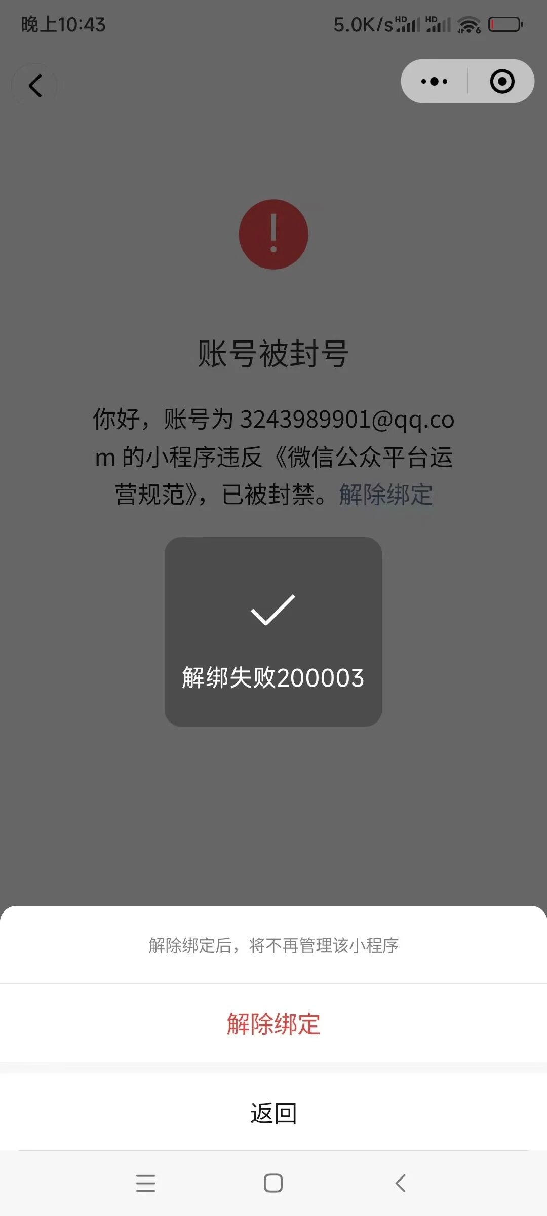 原先公司的小程序绑定的管理员,被永久封禁,我这边为什么解绑不了?提示200003