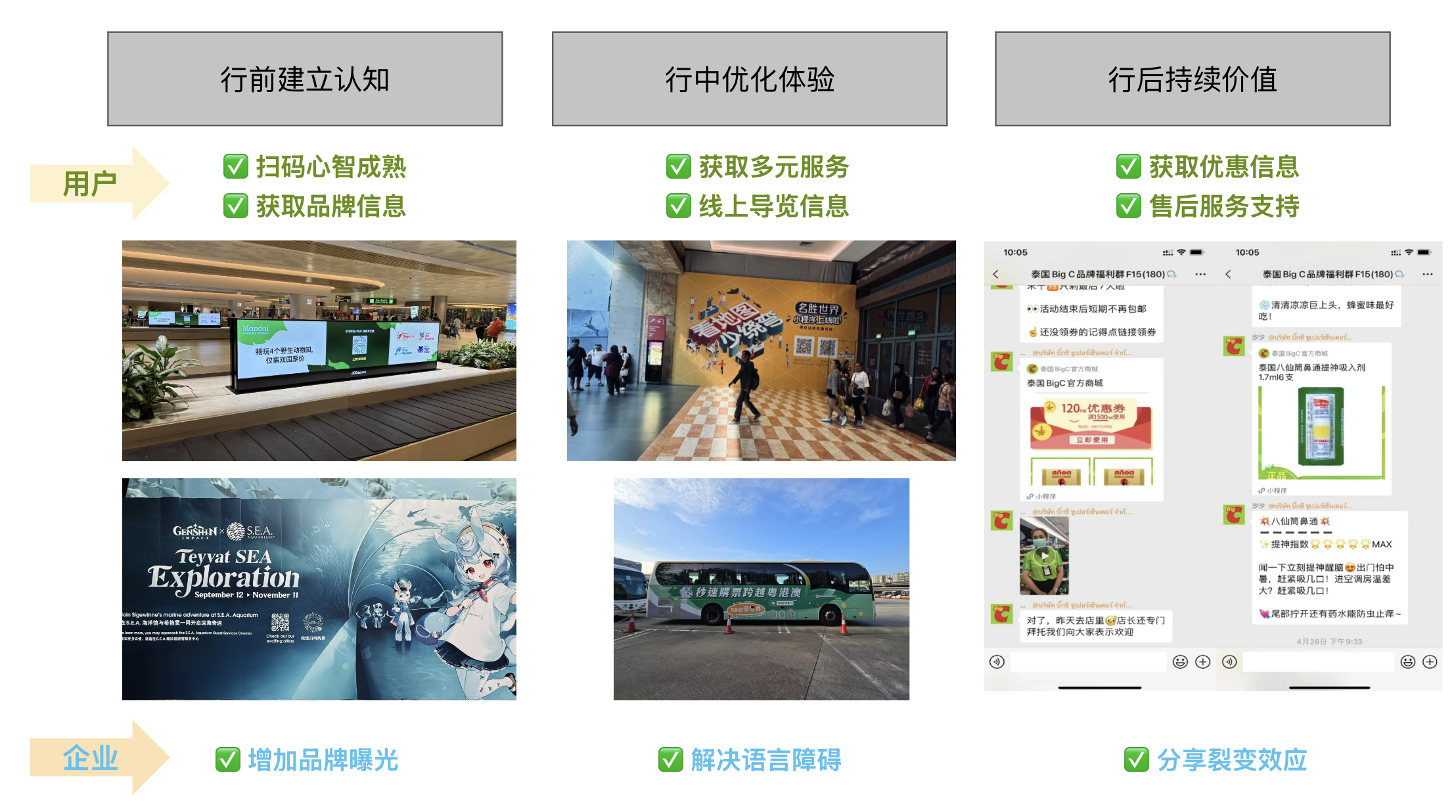 - 获取品牌信息:机场、车站等线下核心场景铺设二维码,用户通过扫码可提前获取品牌信息,或完成景点、交通、外卖、酒店等服务的线上预约。
