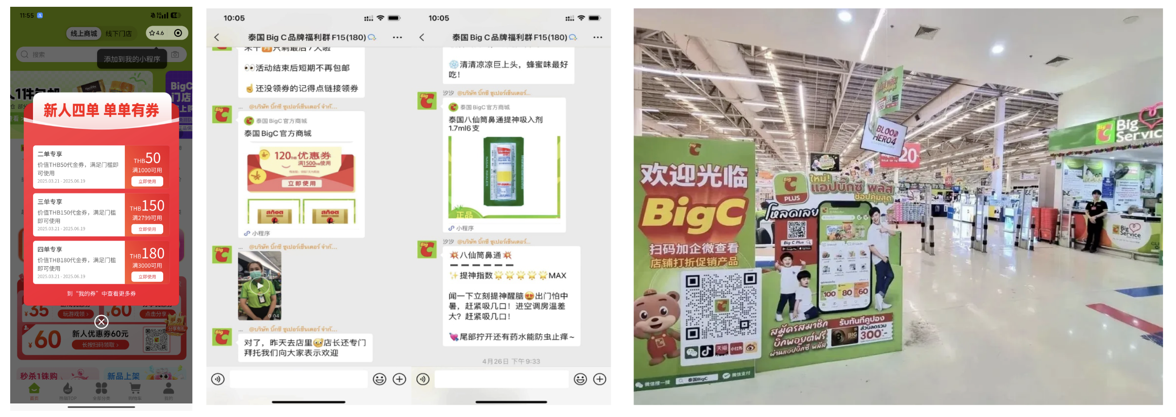 而在线下场景,为了让更多中国游客感知到线上全方位数字化服务的存在,Big C在20+核心门店打造"企微社群&小程序入口"矩阵——在热门门店/核心场景均铺设了大量的物料和二维码,实现中国游客从线下流量向私域资产的高效沉淀,单次购买向多次消费的复购转化。经过线下+线上的长期精细化运营,Big C 的业绩也取得了巨大的突破: