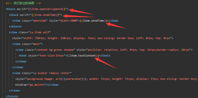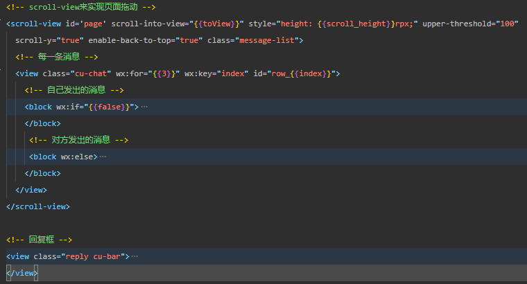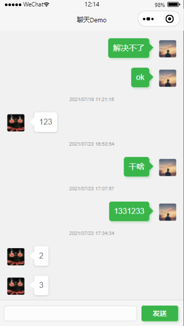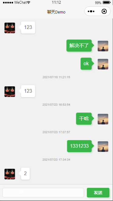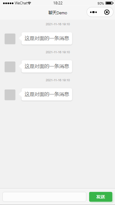 整一个页面说白了就是由一个scroll-view和一个回复框组成,scroll-view中由消息数组构成,消息的内容可以自己定义(时间,头像,消息内容等等)