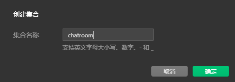 在编辑器打开云开发控制台,点击数据库,再点击集合名称右边加号,创建一个集合名称为chatroom的表。