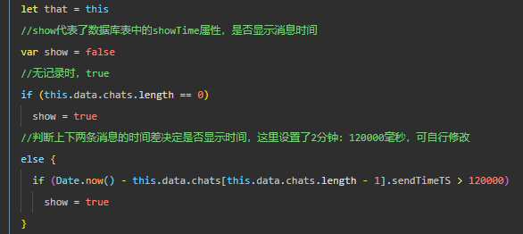 //判断上下两条消息的时间差决定是否显示时间,这里设置了2分钟:120000毫秒,可自行修改