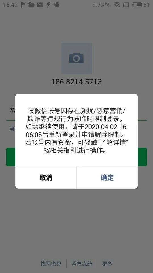 我微信是工作微信,24号在微信上与举报者工作协商不一致,举报者心怀怨恨,伙同我微信上其他联系人一起(我们雇主,他们是被雇员,他们都是认识的)举报我微信存在骚扰等消息,导致我微信被限制登录,然后我自助解封。